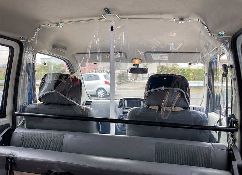運転席と荷室を仕切るカーテンです。それぞれを独立したスペースにすることにより、冷暖房効率が良くなります。又透明なフィルムを使用しているので、荷室の状態や車両後方の確認も容易にできます。